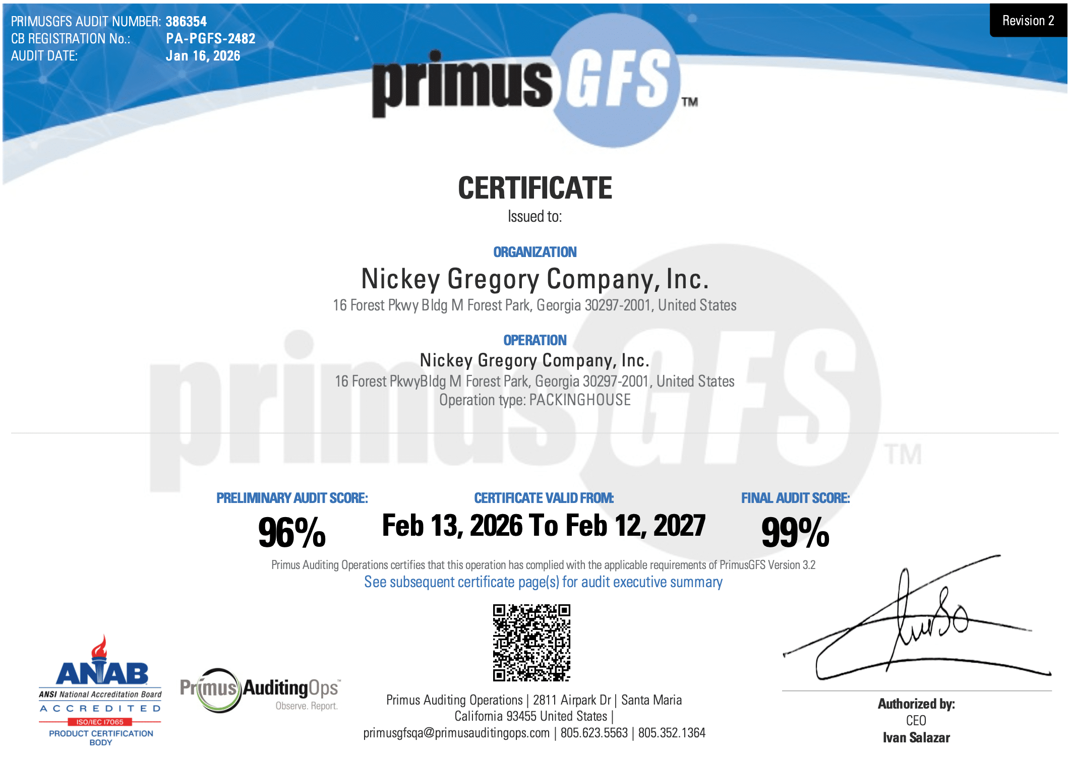 Food safety is critical in our industry. At Nickey Gregory Company, we operate at the highest levels of food safety and handling to make sure you get the freshest, safest, most wholesome fruits and vegetables.